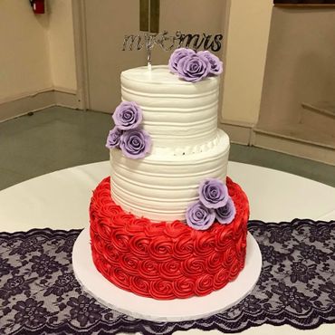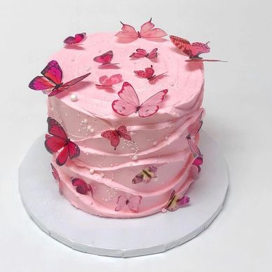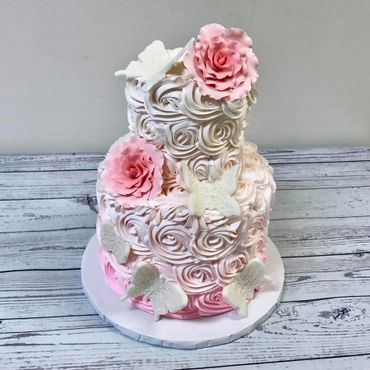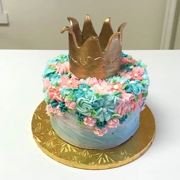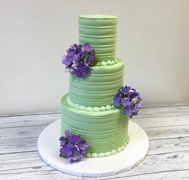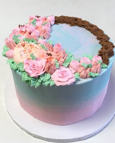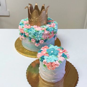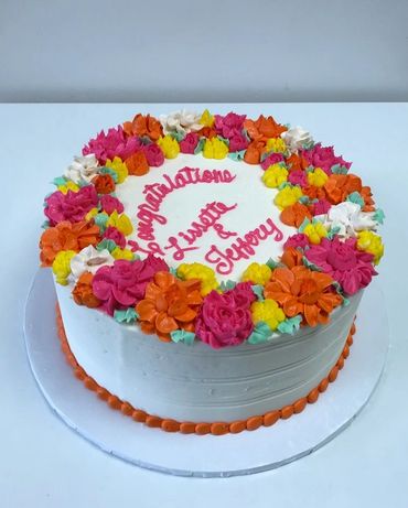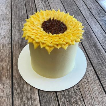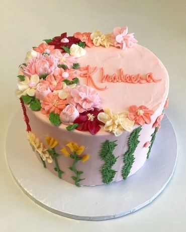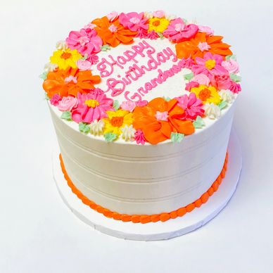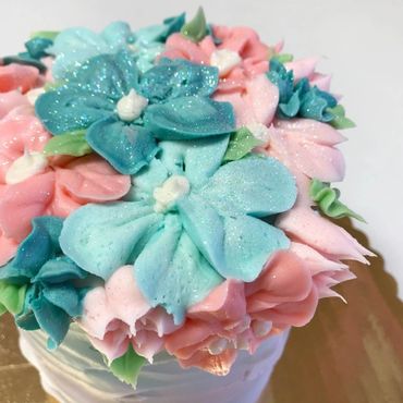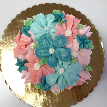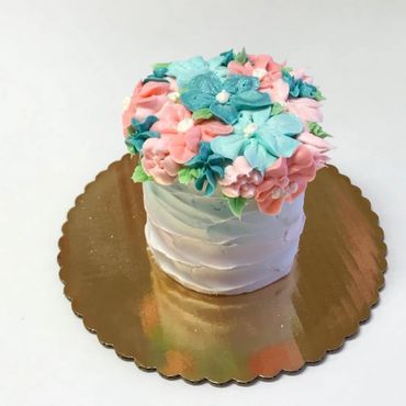 These cakes are covered in smooth or textured buttercream and decorated with our hand piped buttercream flowers.