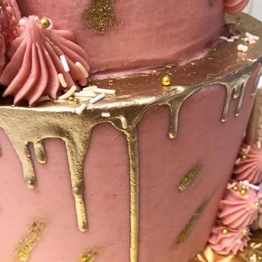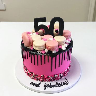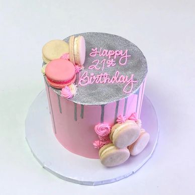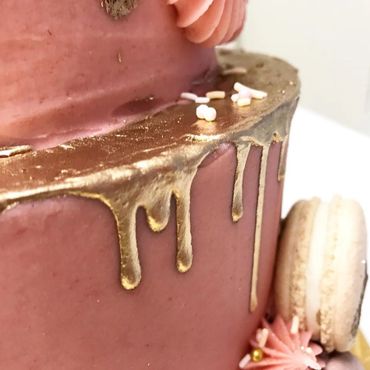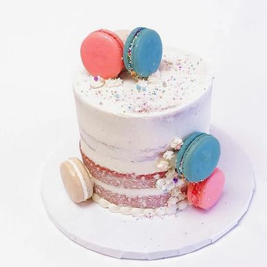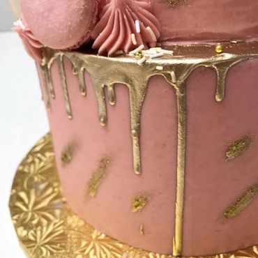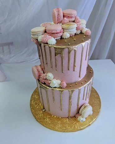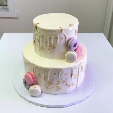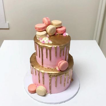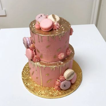 Whimsical cake decorated, covered in buttercream and topped with our French Macarons, and metallic or chocolate drizzle.