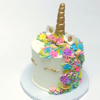 Whimsical cake decorated as a unicorn, covered in vanilla buttercream with sugar and fondant decorations.