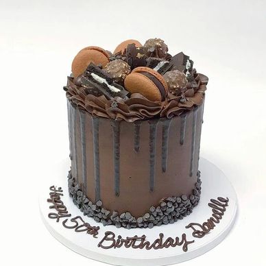 Chocolate Cake filled and covered with Chocolate buttercream, topped with chocolate drip, chocolate French Macarons & Oreos.