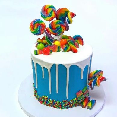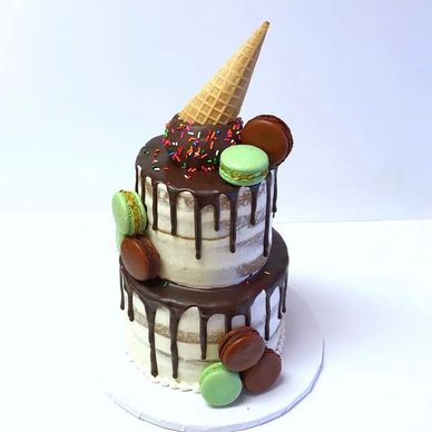 Your choice of cake and filling flavors. This cake is decorated with a melting "ice cream" cone and our popular French Macarons.
