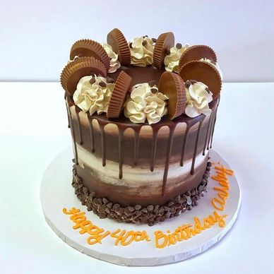 Chocolate cake filled with Peanut Butter buttercream. Covered in both Peanut Butter and Chocolate buttercream, topped with Chocolate drip and peanut butter cups.