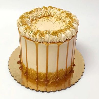 Layers of vanilla cake filled and covered with dulce de leche buttercream and caramel drip.