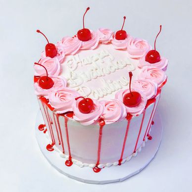 Layers of cherry cake and cherry filling, covered in vanilla buttercream and topped with maraschino cherries and cherry drip.