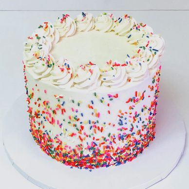 Layers of confetti cake filled with vanilla buttercream, covered in vanilla buttercream and decorated with sprinkles.